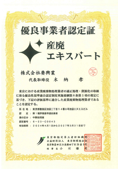 要興業は、平成21年の制度発足第1回目に、東京都の指定する第三者評価機関としての(公財)東京都環境公社により、業界のトップランナー的業者と評される「産廃エキスパート」に認定されました。